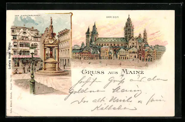 Lithographie Mainz, Der Marktbrunnen, Der Dom