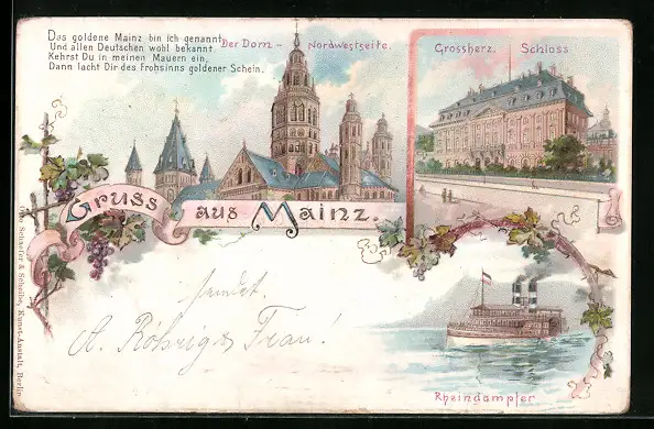 Lithographie Mainz, Dom, Grossherz. Schloss, Rheindampfer