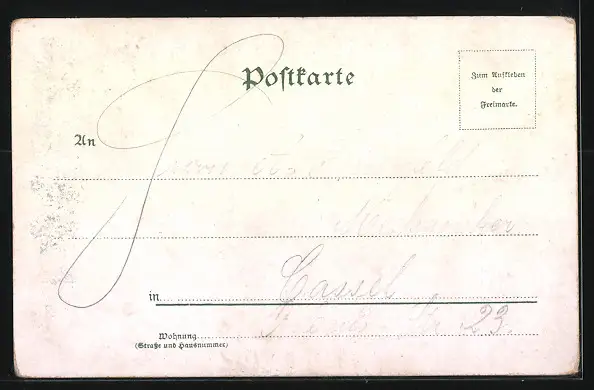 Personenbezogene Daten auf der Rückseite der Karte wurden durch blauen Textmarker unkenntlich gemacht. Die blauen Stellen sind auf die Vorderseite durchgeweicht und wirken sich negativ auf das Postkartenfoto aus