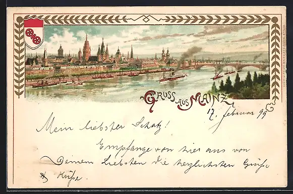 Lithographie Mainz, Flusspartie mit Dampfer