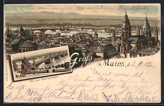 Lithographie Mainz, Gesamtansicht, neue Rheinbrücke