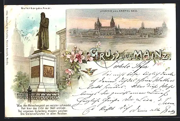 Lithographie Mainz, Gutenbergdenkmal, Ortspanorama