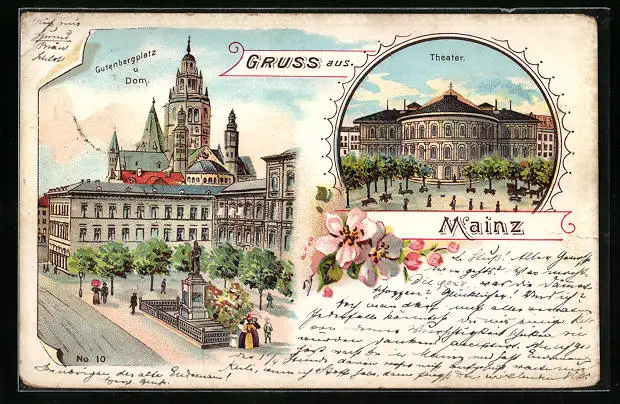 Lithographie Mainz, Gutenbergplatz u. Dom mit Denkmal, Theater