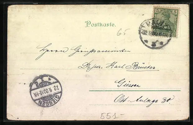 Personenbezogene Daten auf der Rückseite der Karte wurden durch blauen Textmarker unkenntlich gemacht. Die blauen Stellen sind auf die Vorderseite durchgeweicht und wirken sich negativ auf das Postkartenfoto aus