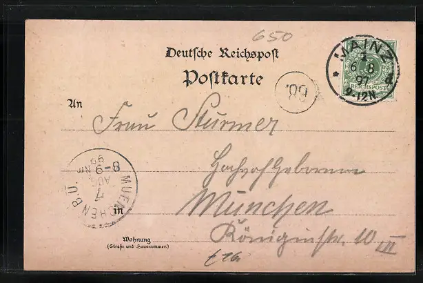 Personenbezogene Daten auf der Rückseite der Karte wurden durch blauen Textmarker unkenntlich gemacht. Die blauen Stellen sind auf die Vorderseite durchgeweicht und wirken sich negativ auf das Postkartenfoto aus