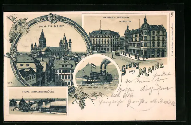 Lithographie Mainz, Mainzer und Rheinische Bierhallen, Dom, Rheindampfer