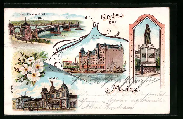 Lithographie Mainz, Neue Strassenbrücke, Speicher am Hafen, Bahnhof