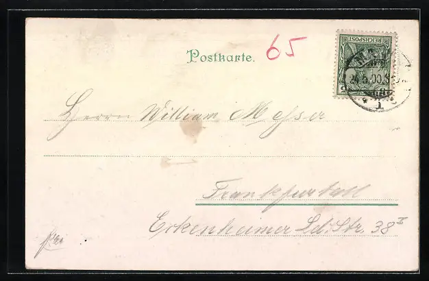 Personenbezogene Daten auf der Rückseite der Karte wurden durch blauen Textmarker unkenntlich gemacht. Die blauen Stellen sind auf die Vorderseite durchgeweicht und wirken sich negativ auf das Postkartenfoto aus