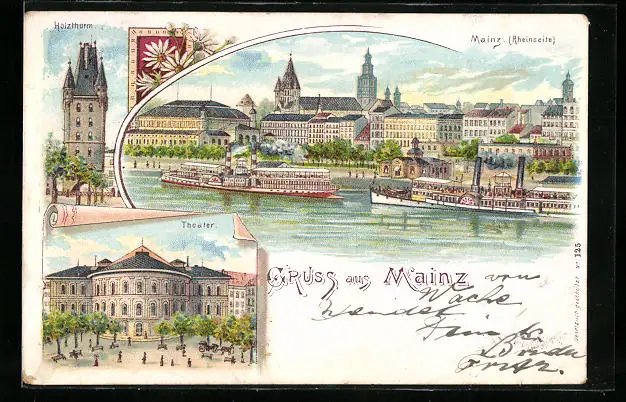 Lithographie Mainz, Ortsansicht mit Rhein-Partie, Holzthurm, Theater