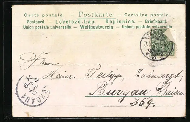 gelaufen 1901, Briefmarke tw. entfernt, rückseitig Oberflächenschaden, guter Zustand