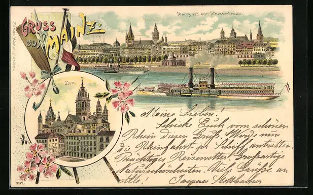 Lithographie Mainz, Ortsansicht von der Strassenbrücke, Dom