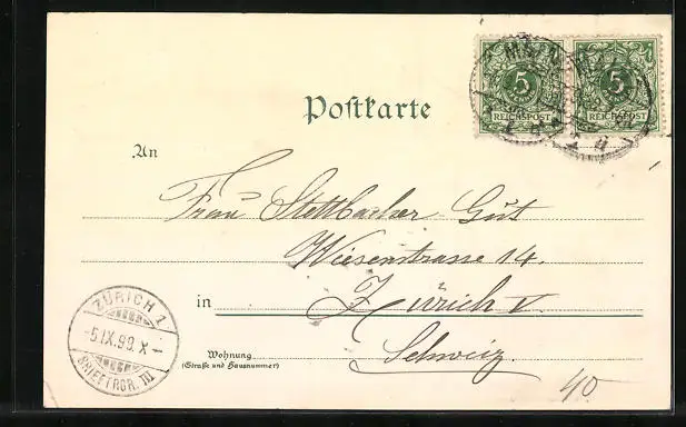 Personenbezogene Daten auf der Rückseite der Karte wurden durch blauen Textmarker unkenntlich gemacht. Die blauen Stellen sind auf die Vorderseite durchgeweicht und wirken sich negativ auf das Postkartenfoto aus