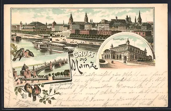 Lithographie Mainz, Stadthalle und neue Rheinbrücke