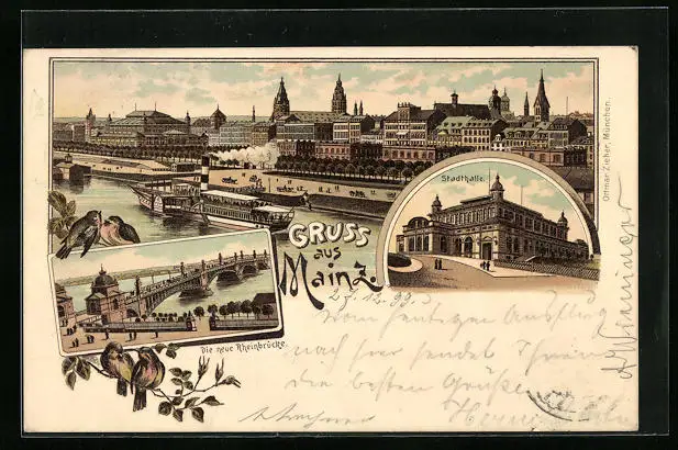 Lithographie Mainz, Teilansicht, Stadthalle, Rheinbrücke