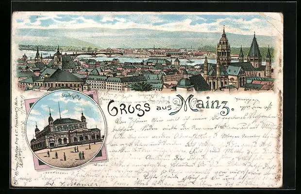 Lithographie Mainz, Teilansicht aus der Vogelschau, Stadthalle