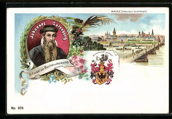 Lithographie Mainz, Teilansicht mit Brücke, Johannes Gutenberg, Buchdrucker-Wappen