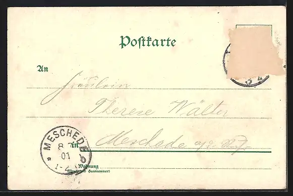 gelaufen 1901, Briefmarke entfernt, rückseitig Oberflächenschaden, Stempelspur, guter Zustand