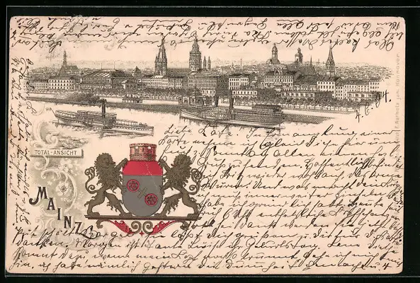 Lithographie Mainz, Totalansicht, Flusspartie mit Dampfer und Stadtwappen