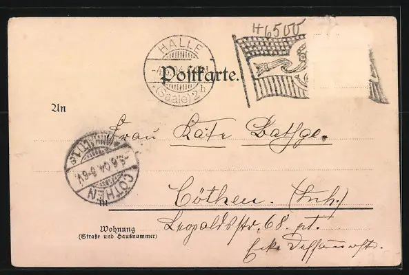 gelaufen 1904, Briefmarke entfernt, rückseitig Oberflächenschaden, Eckknick li. unten, Einriss re. mittig