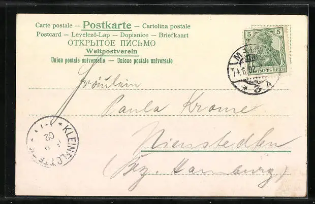 gelaufen 1902, kleiner Einriss links oben, guter Zustand