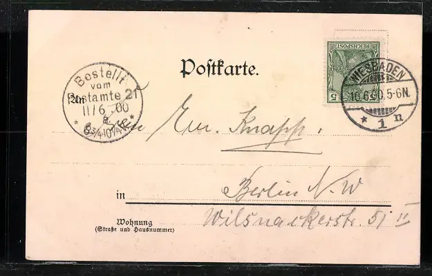 Personenbezogene Daten auf der Rückseite der Karte wurden durch blauen Textmarker unkenntlich gemacht. Die blauen Stellen sind auf die Vorderseite durchgeweicht und wirken sich negativ auf das Postkartenfoto aus