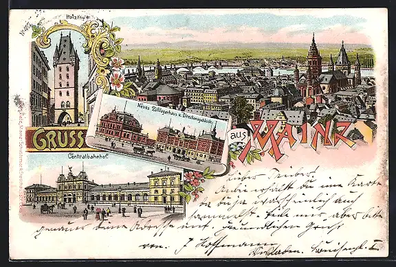 Lithographie Mainz, Totalansicht mit Centralbahnhof