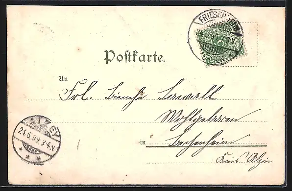 gelaufen 1899, Eckknick li. unten, obere u. rechte Kante beschnitten
