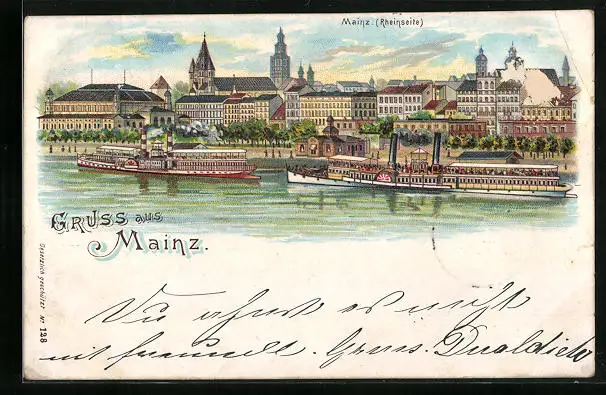 Lithographie Mainz, Totalansicht mit Dampfern