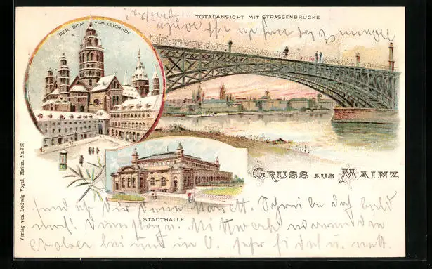 Lithographie Mainz, Totalansicht mit Strassenbrücke, Dom und Stadthalle