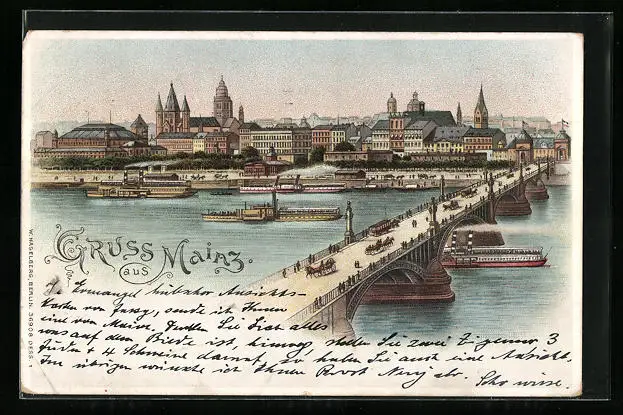 Lithographie Mainz, Uferpartie mit Brücke und Dampfer