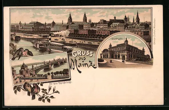 Lithographie Mainz, Uferpartie mit Dampfer, Neue Rheinbrücke