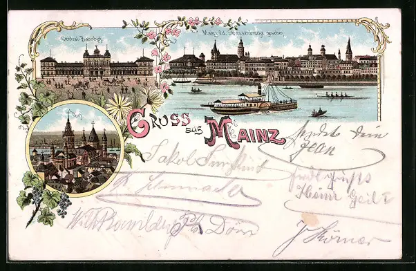Lithographie Mainz, Zentralbahnhof, Panorama von der Strassenbrücke, Dom