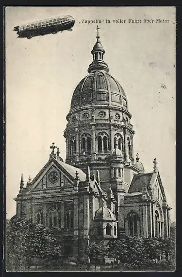 Lithographie Mainz, Zeppelin in voller Fahrt, Dom