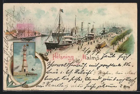Lithographie Malmö, Panorama vom Hafen, Leuchtturm