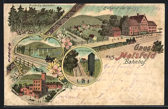 Lithographie Malsfeld, Bahnhof, Rittergutsbrauerei, Hohe Treppe