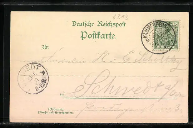 Personenbezogene Daten auf der Rückseite der Karte wurden durch blauen Textmarker unkenntlich gemacht. Die blauen Stellen sind auf die Vorderseite durchgeweicht und wirken sich negativ auf das Postkartenfoto aus