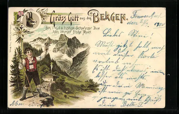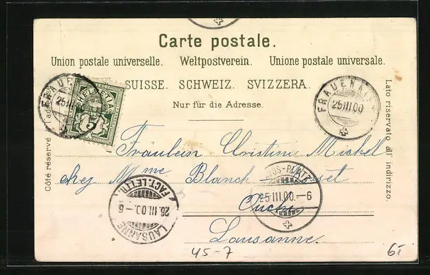 Personenbezogene Daten auf der Rückseite der Karte wurden durch blauen Textmarker unkenntlich gemacht. Die blauen Stellen sind auf die Vorderseite durchgeweicht und wirken sich negativ auf das Postkartenfoto aus