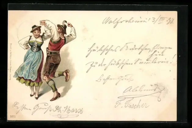 Lithographie Mann und Frau in Trachten beim Volkstanz