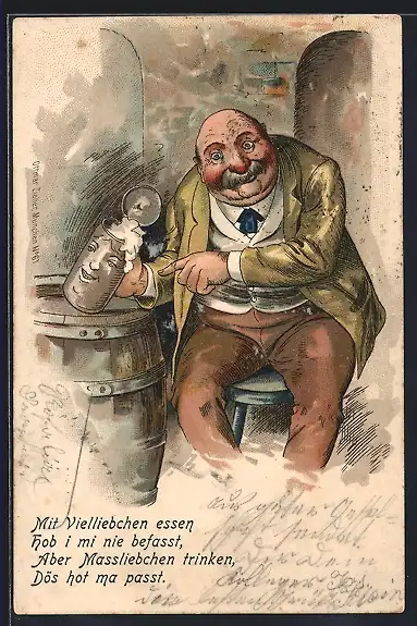 Lithographie Mann zeigt auf einen Bierkrug mit Gesicht