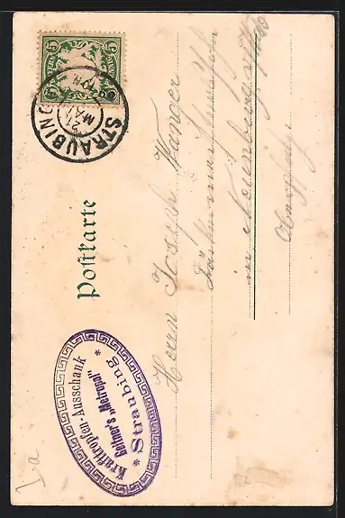 Personenbezogene Daten auf der Rückseite der Karte wurden durch blauen Textmarker unkenntlich gemacht. Die blauen Stellen sind auf die Vorderseite durchgeweicht und wirken sich negativ auf das Postkartenfoto aus
