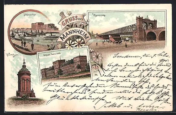 Lithographie Mannheim, Hafenpartie, Rheinbrücke, Wasserturm, Schloss (Gartenseite)