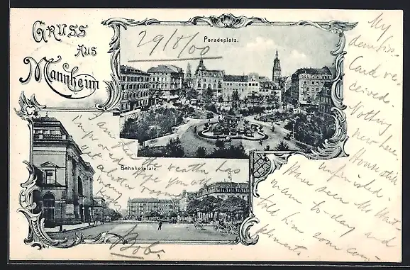 Lithographie Mannheim, Paradeplatz, Bahnhofplatz