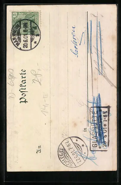 Personenbezogene Daten auf der Rückseite der Karte wurden durch blauen Textmarker unkenntlich gemacht. Die blauen Stellen sind auf die Vorderseite durchgeweicht und wirken sich negativ auf das Postkartenfoto aus