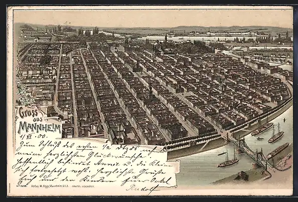 Lithographie Mannheim, Totalansicht der Stadt der Quadrate