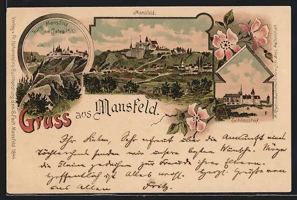 Lithographie Mansfeld, Teilansicht, Burg Mansfeld, Schlosshof