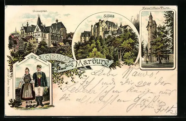 Lithographie Marburg, Universität, Schloss, Paar in Tracht