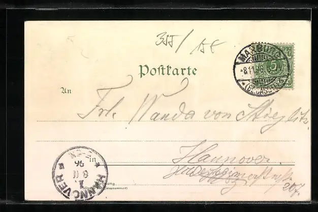 Personenbezogene Daten auf der Rückseite der Karte wurden durch blauen Textmarker unkenntlich gemacht. Die blauen Stellen sind auf die Vorderseite durchgeweicht und wirken sich negativ auf das Postkartenfoto aus
