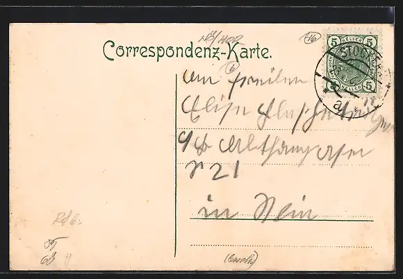 Personenbezogene Daten auf der Rückseite der Karte wurden durch blauen Textmarker unkenntlich gemacht. Die blauen Stellen sind auf die Vorderseite durchgeweicht und wirken sich negativ auf das Postkartenfoto aus