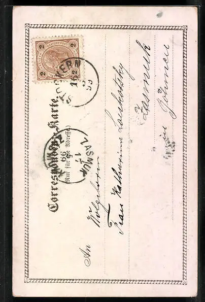 Personenbezogene Daten auf der Rückseite der Karte wurden durch blauen Textmarker unkenntlich gemacht. Die blauen Stellen sind auf die Vorderseite durchgeweicht und wirken sich negativ auf das Postkartenfoto aus