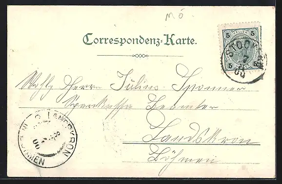 Personenbezogene Daten auf der Rückseite der Karte wurden durch blauen Textmarker unkenntlich gemacht. Die blauen Stellen sind auf die Vorderseite durchgeweicht und wirken sich negativ auf das Postkartenfoto aus